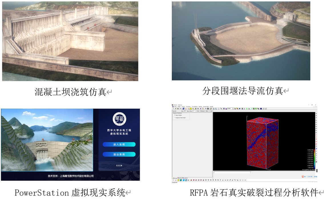 本实验室拥有水利工程施工项目仿真实训软件、溢流坝泄流三维虚拟仿真软件、水电站结构仿真交互软件、PowerStation虚拟现实系统、水工计算软件、百图软件、PKPM结构分析软件、DHI MIKE21二维水模拟软件、RFPA岩石真实破裂过程分析软件、水击虚拟仿真软件、Kingview软件、Labview软件等,能够开展土石坝分层填筑施工、重力坝分缝分块浇筑、施工导流仿真、溢流坝泄流三维虚拟仿真、水电站结构仿真、水电工程虚拟现实仿真、岩石常规及特殊赋存环境下的力学实验仿真、三维实体开挖计算、土石坝渗流及稳定分析、水力计算、钢筋混凝土构件计算、桥涵及隧洞计算、建筑结构计算、压力管道水击虚拟仿真、水电站技术供水自动控制、基于虚拟仪器的模拟信号采集等工作。