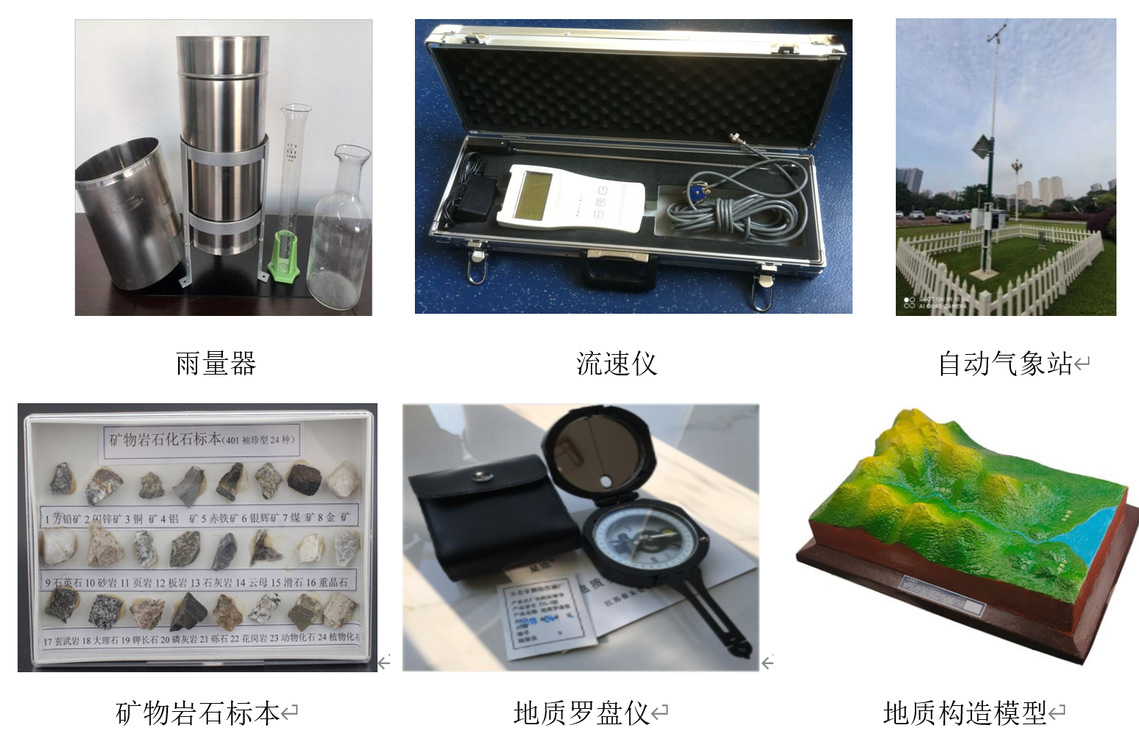 水文与地质实验室现有雨量器、蒸发器、流速仪、自动气象站、自制雨量监测仪、矿物岩石标本、地质罗盘仪、地质构造模型等实验设备,能够开设降雨量观测、蒸发量观测、断面流量测验、岩石标本识别与分析、地质构造分析、岩层产状测量等实验项目。